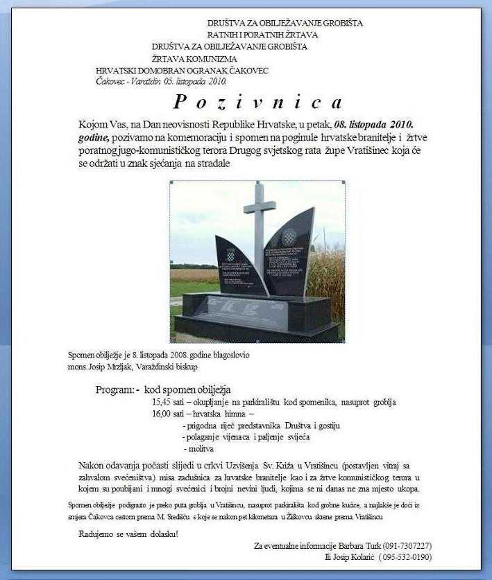 Poštovani gospodine župniče, dragi prijatelji, prvo Vam svima čestitam današnji praznik, Dan neovisnosti, Republike Hrvatske, ujedno Vam prenosim pozdrave prof dr. Zvonimira Šeparovića, poznatog svjetskog viktimologa i predsjednika Hrvatskog žrtvoslovnog društva koji zbog obveza u Njemačkoj danas nije mogao biti s nama. Dana 8. listopada u Hrvatskoj se kao državni blagdan obilježava Dan neovisnosti u sjećanje na dan kada je Sabor Republike Hrvatske 1991. godine jednoglasno donio Odluku o raskidu svih državnopravnih veza Republike Hrvatske s bivšom državom. Dakle danas se sjećamo dana kada je izabrana hrvatska vlast smogla snage donijeti odluku koju su kasnije hrvatski branitelji i diplomacija, uz brojne hrvatske žrtve uspjeli ovjekovječiti i čiji san mi nesmetano uživamo. Danas se ujedno sjećamo brojnih prešućenih hrvatskih žrtava koje su tijekom minulih stoljeća svoje živote ugradili u hrvatsku samostalnost, kao i brojnih stradalih proganjanih i ubijenih od raznih zavojevača i ideologa koji su nastojali uništiti dostojanstvo čovjeka, njegovu vjeru u Boga i kršćansku tradiciju. Poznato je da su hrvatske dobrovoljačke snage pod zapovjedništvom Slavka Kvaternika i potpukovnika Dragutina Perka (vz- 1875 – Varaždin 1945) s više od četiri tisuće hrvatskih vojnika dragovoljaca 24. prosinca ušle u Međimurje (Zvonimir Bartolić - HKK-2001- strana 49-53) te je time prestala mađarizacija Međimurja. Po ulasku partizana u Varaždin 1945 jedan od žrtva bio je, uz više stotina stradalih, i tada već dugo umirovljeni Dragutin Perko, a iz vojne akcije za oslobođenje Međimurja te 1918. godine nije se vratio ni moj praujak, bakin brat Franjo Hutinski. Mnogi hrvatski političari tog vremena 1918. godine bili su pogleda uprtih prema Beogradu, i dok je nova vlast u smirivanje tadašnjih brojnih pobuna pozvala srpsku vojsku istodobno je radila na raspuštanju Hrvatskog domobranstva koje je od 1868 kao sastavnica austro-ugarske vojske. Hrvatsko domobranstvo raspolagalo je s više desetaka tisuća hrvatskih vojnika kojima su na hrvatskom jeziku zapovijedali hrvatski časnici. U oslobađanju Međimurja od mađarskog jarma sudjelovale su eto hrvatske snage, a ne snage zajedničke države koju su stvorili hrvatski političari. Oni koji su doprinijeli ujedinjenju i danas imaju svoje ulice, a za grob Dragutina Perka se ni danas ne zna, pretpostavljamo da je na obali Drave, uz tisuće tamo ubijenih. Danas na Dan neovisnosti sjećamo se i hrvatskih zastupnika ubijenih 1928. godine u Beogradskoj skupštini, ubijen je Jura Basariček i Pavao Radić, a kasnije je preminuo i Stjepan Radić. Sjećamo se i od srpskih žandara ubijenog oca Ivana Varge iz Donje Dubrave u ljeto 1934. godine za čije ubojstvo je općina Donja Dubrava od obitelji zatražila plaćanje metaka kojim je otac ubijen, a sjećamo se i mnogih drugih koji su životom stradali od terora tadašnje vlasti a za koje vijest nije doprla do zagrebačkog nadbiskupa (nadbiskup Antun Bauer je 25 . svibnja 1935. otputovao u Beograd zatraživši zaštitu stanovništva od žandarskih progona kod kneza Pavla Karađorđevića i ministra vojske Petra Živkovića – Vladimir Pavlinić - Kana ožujak-2010, strana 18 i 19 ). Sjećamo se i ratnih i poratnih stradanja Drugog svjetskog rata, a eto ove godine sjetili smo se brojnih tragičnih događaja i žrtava iz tog razdoblja. Ove godine priredili smo i sudjelovali na desetak komemoracija i sjećanja na žrtve iz tog vremena, od sjećanja na žrtve Štrigove, koje je bilo početkom travnja, Dravske šume Varaždin do sjećanja na preko 70 žrtava grobišta Leskovec, 26. rujna, a koje su po partizanima poubijane 29. rujna 1943. godine. Sudjelovali smo i na Petom hrvatskom žrtvolsovnom kongresu, a i na ukopu posmrtnih ostataka ekshumiranih žrtava na Daksi kod Dubrovnka, 19. lipnja. Sudjelovali smo i na misi (26. srpnja na blagdan svete Ane) za žrtve poubijane 27. srpnja 1941. godine, a koju je kod crkve Svete Ane u Kosovu kod Knina služio biskup šibenski mons Ante Ivas. O tadašnjim ubojstvima od strane četnika i komunista znamo danas iz brojnih svjedočenja, a u izrečenoj propovijedi tragičnu povijest ovog događaja izrekao je i sam šibenski biskup. mons. Anet Ivas, koji je okolnosti stradanja hodočasnika iz 1941. godine prenio riječima: Danas se sjećamo i ubijenog župnika Ivana Mađarića, rođenog u ovoj župi, ubijenog od Nijemaca 1941. u Križovljanu i ovih ovdje stradalih, za čija imena ćemo kasnije čuti, kao i ubijenog vlč Hinka Krodera, a danas se sjetimo i ubijenih i stradalih brojnih hrvatskih branitelja i žrtava totalitarnih sustava prošlog stoljeća. Godinama su nas trovali lažima i izvitoperenim istinama, u koje smo vjerovali, a u pamćenje usađena neistina nije nam dozvolila da činjenice vidimo kao činjenice i zločin kao zločin. Kod toga smo sami sebe uvjeravali da to ne može biti istina, da takova zlodjela ljudska ruka ne može izvršiti, a kad ono svakim danom mrtve kosti nanovo i ponovo nam progovaraju. I dok smo nad bestijalnošću smrti ranjenika u Jazovci, i na našim grobištima s nevjericom slušali dotle nas svakim danom novom grozom ispunjaju vijesti s grobišta u Sloveniji (vidi izvještaj s 5 hrvatskog žrtvoslovnog kongresa- http://www.safaric-safaric.si/materiali_cro/Autori_Cro.htm ft), a svakim novim vijestima strahujemo da ćemo saznati za još grozomornija zlodjela i ubojstva koja je izopačeni ljudski um u svojem zločinačkom i ubilačkom pohodu na ljudsko dostojanstvo bio spreman učiniti. Kod pokopa ekshumiranih žrtava grobišta Sep u Gornjem Hrašćanu, 23. kolovoza, biskup Josip Mrzljak u propovijedi je istaknuo da se unatoč brojnim deklaracijama i osudama komunističkog sustava nešto značajnije u Hrvatskoj po pitanju dostojanstva žrtava nije dogodilo“ Kao da nad Hrvatskom i danas lebdi duh komunizma i prešućivanja?!! Pitanje je što nam ostaje?!. Upravo ovo što činimo, za žrtve s moliti, postaviti im sp