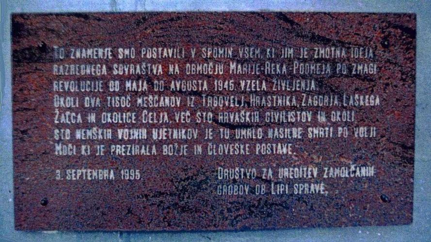 Na spominski plošči je zapisan namen postavitve: »To znamenje smo postavili v spomin vsem, ki jim je zmotna ideja razrednega sovraštva na območju Marija Reka-Podmeja po zmagi revolucije od maja do avgusta 1945 vzela življenje. Okoli 2000 meščanov iz Trbovelj, Hrastnika, Zagorja, Laškega, Žalca in okolice Celja, več sto hrvaških civilistov in okoli sto nemških vojnih ujetnikov je tu umrlo nasilne smrti po volji Moči, ki je prezirala božje in človeške postave. 3. septembra 1995." Postavil jo je Odbor Zasavje pri Društvu za ureditev zamolčanih grobov Republike Slovenije.