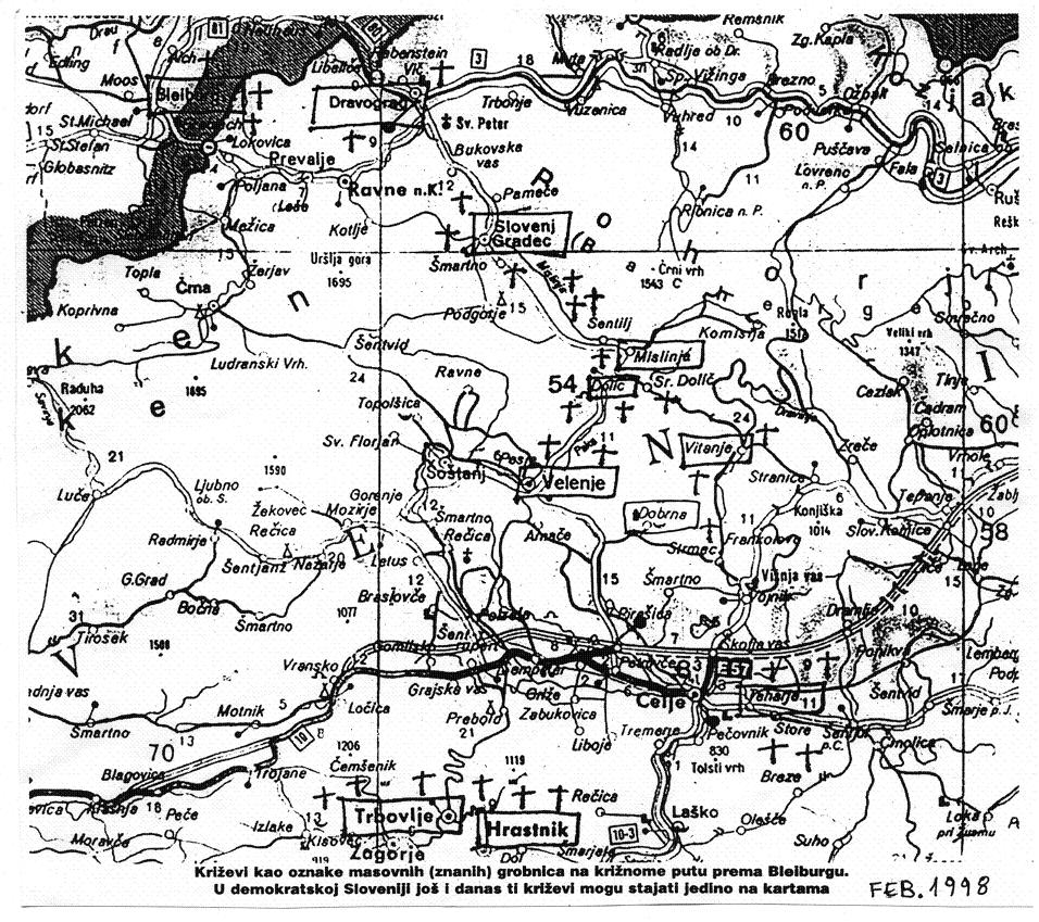 | | Ovaj text je bio objavljen u «Hrvatskom slovu», 13.veljaće 1998.godine, DA SAM IMAO HRVATSKU Na kraju Drugog svjetskoga rata i u prvim mjesecima poslije kapitulacije, svo nekomunističko, a inače brojno stanovništvo Titove Jugoslavije, uključujući i pripadnike poraženih vojski, bježalo je spašavajući se pred osvetoljubivim koljačima, koji su se domogli vlasti. Slovenska vrata tada su bila jedina vrata prema Zapadu, prema Austriji i Italiji. Partizani nikada nisu priznali da je to bio strahoviti pokolj, nečovječna odmazda nad ranjenicima, nad ratnim zarobljenicima, nad onima koji su se predali, nad domobranima, četnicima i ustašama, ali i nad nedužnim civilima; nad starcima, ženama i djecom. O tome postoje metri i metri filmske vrpce, koju su partizani snimali i ponosno pokazivali poslije rata. Time su se ponosili kao pobjedom. TV Ljubljana pokazala je u prosincu 1996. dio tog materijala. Svi oni, po komunističkomu svjetonazoru "tko nije s nama - taj je protiv nas", nisu imali pravo na život čak ni negdje drugdje, izvan totalitarne, zločinačkim rukama stvorene, socijalističke Jugoslavije. Slovenija je tako išarana jamama prepunim ljudskim kostima, masovnim grobnicama, zabetoniranim oknima napuštenih rudnika u kojima je najviše mrtvih upravo Hrvata. Velika većina njih nema ni obilježja, ni križa. Postojeća slovenska komunistička vlast još nije spremna suočiti se s tom mračnom "epizodom" u nedavnoj im prošlosti. To posebno smeta napadanom i čestim polemikama izloženom Medimurcu Dragutinu Šafariću, Hrvatu, koji već toliko dugo živi u Velenju da mu ni slovenski jezik, ni mentalitet nisu nepoznanica. Prije petnaestak godina, zainteresirala ga je, kao građevinara pojava čestih iskapanja ljudskih kostiju na mjestima gdje su se gradile kuće. Tako je započeo razgovarati s ljudima iz okolice, skupljati podatke, ucrtavati masovne grobnice u karte, fotografirati ih, i poticati svjedoke da se oslobode straha i otkriju mu istinu. Njih je svakim danom bilo sve manje, a reakcija svakojakih: od burnih, odbijajućih ili prestrašenih do mučnih, rijetko razgovorljivih, te pouzdanih i vjerodostojnih. Istinu koju su mu ispripovijedali, a koju je kasnije nekoliko puta provjeravao, složio je u stravičan mozaik svekolike patnje Hrvata u danima prije dolaska na Bleiburg i mjesecima poslije njega. Dolaskom demokracije i priča o ljudskim pravima Šafariću se učinilo nevjerojatnim da Slovenija može tražiti članstvo u Vijeću Europe i u Europskoj Uniji prije nego otvori svoje partizanskejame i sve zločine, kojih je na stotine. Bilo mu je takoder nelogično da slovenska država priznaje talijansku i vrlo malobrojnu madarsku manjinu, a ne priznaje više od sto tisuća Hrvata. Celje je od Zagreba udaljeno jedva osamdesetak kilometara, a nekadašnje Titovo Velenje još dodatnih osamnaest. Pet kilometara sjeverno od Velenja, u kanjonu rječice Pake, nalazi se Huda Luknja. Tako doista taj kanjon i izgleda. U knjizi Veliki finale na Koroškem autor Franci Sterle opisuje dramatične događaje u Hudoj Luknji sredinom svibnja 1945. Scenarij pokolja bio je sljedeći, kako pišu u slovenskome tisku gimnazijalke Nika, Duška i Ana u prosincu 1992.: Partizani su svibnja 1945. zaustavili bijeg "ustaške sile" i njemačkih četa zahtijevajući predaju i polaganje oružja. Ustaše nisu vjerovale da će partizani poštivati ratne konvencije o vojnim zarobljenicima i odlučili su se na otpor. Neravnopravna bitka u kanjonu i dolini G. Doliča (Pancer Greben), te na području Mislinje, trajalaje dva dana. Nadmoćna partizanska brigada imala je deset (10!) poginulih. Na ustaškoj je strani palo 3.000 muškaraca, a zarobljeno ih je gotovo 11.000! Procjene su da je to tek trećina odista pobijenih u toj klopci. Kako inač¸e objasniti da je u deset velikih skupnih jama bez obilježja pokopano gotovo 5.000, navodno, isključivo ustaša. I kakav je to boj u kojem je omjer "pobjednika" i "poraženih" 10: 14.000! ? Monstruozno je i to da su kuće sagrađene oko te grobnice... Očevidci su izjavili da se "zbog tisuća i tisuća mrtvih između Hude Luknje i..." (sjevernije - op. J. N.), "Mislinje širio tako jaki smrad da su uokolo, četiri godine, pčele umirale". Profesor Damjan Kljajić te događaje naziva masakrom u Hudoj Luknji. Smatra da su ga izvele trupe pridošle s juga, i da je slovenskih partizana među njima bilo malo. Većina jedinica bile su crnogorske i dalmatinske. Kako su ustaše bile sa svih strana okružene kanjonom, partizanskih je žrtava bilo zanemarivo malo. Oni su ih dočekali na obroncima. Bile su to zaključne partizanske "operacije", kako kaže, s kraja travnja i početka svibnja 1945. Po toj tvrdnji mnogo se ustaša probilo do Austrije, gdje su ih na Pliberskom jezeru partizani opet dočekali. Kaznili su ih smrću tobože zato što su bježali s "pokradenim vojnim plijenom." U uvjetima, u kojima se do današnjega dana nikakvom rekonstrukcijom ne može utvrditi ni približan broj poginulih civila; u uvjetima u kojima su trajno ostale nepoznate brojne njihove (tipično partizanski) neobilježene grobnice; u uvjetima u kojima se govori o "vojnom pokradenom plijenu", možemo se s pravom pitati koliko je civila bježalo s vojskom? Što je to, zapravo, "pokradeni vojni plijen"? Zar su to najnužnije osobne stvari, koje su ljudi nosili sa sobom spašavajući se u posljednji tren? Posebno je poglavlje pitanje gdje je taj plijen završio? Jer navodno ga je bilo i mnogo i bio je vrijedan... I na kraju, zar nije logično da su te ustaše, ili brojni civili, koji su s pravom sumnjali u poštenje i moral nove Jugoslavije, išli s vojskom koja je jedina znala najkraći put do Austrije? Mogu li slovenski partizani tako olako sprati ljagu sa sebe riječima: "To su bile ustaše i nitko drugi", ili: "Taj su pokolj počinili partizani s juga"? Rat je bio završen, zašto se ratnim vojnim zarobljenicima nije sudilo? Zbog toga što je postavljao neugodna pitanja i dirao u zabranje